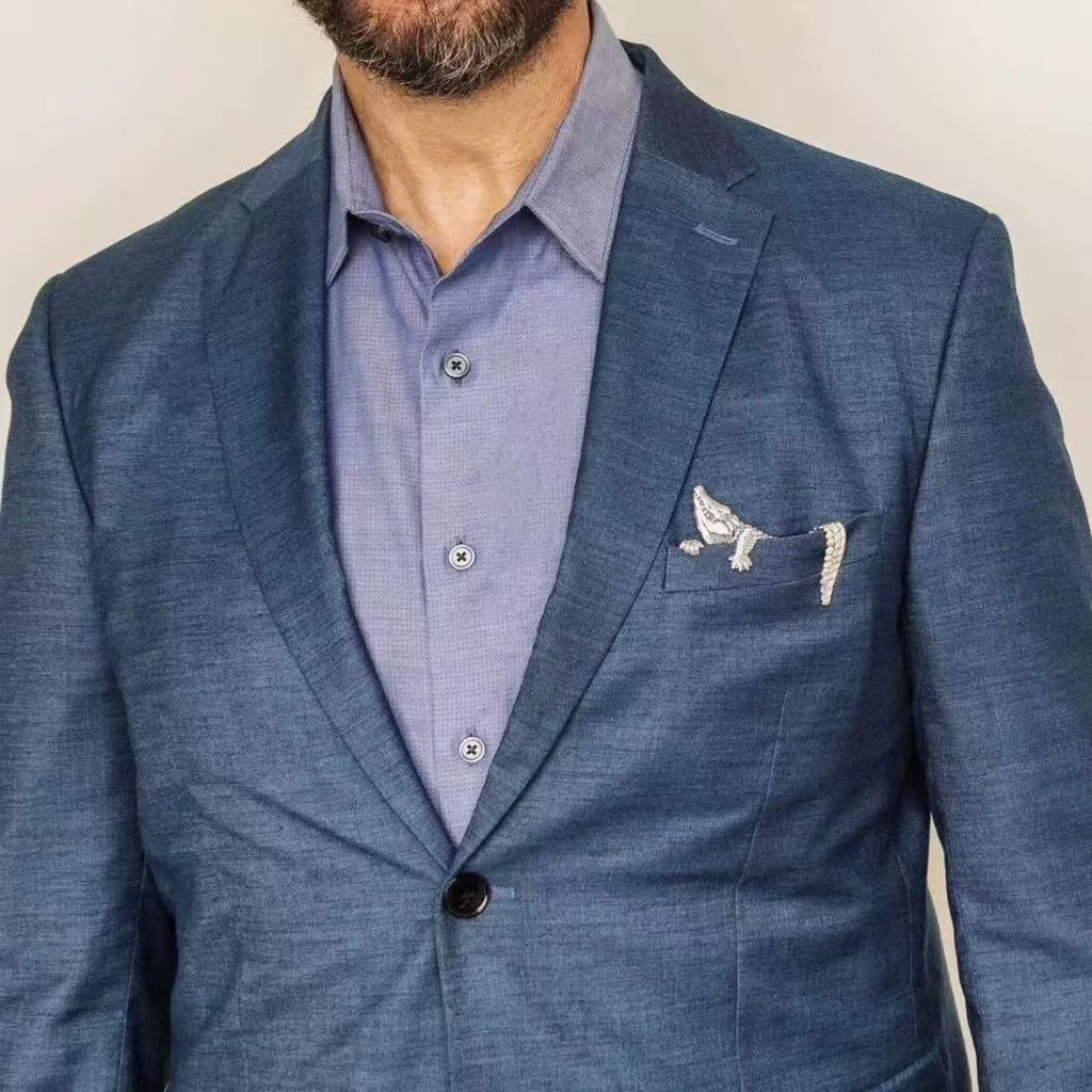 Meet our Sterling Silver Alligator Pocket Badge! This high-quality and creative take on a classic blazer accessory is a fresh take. The hand-engraved design is detailed and instantly eye-catching. Its unique magnetic design allows it to stand upright in any blazer pocket, without the hassle of folding it, adding a touch of style. Say goodbye to your run-of-the-mill silk, linen and cotton pocket squares, this unexpected sterling silver piece pairs perfectly with any color or pattern of suit. For the man who has it all, we guarantee he doesn't have it!