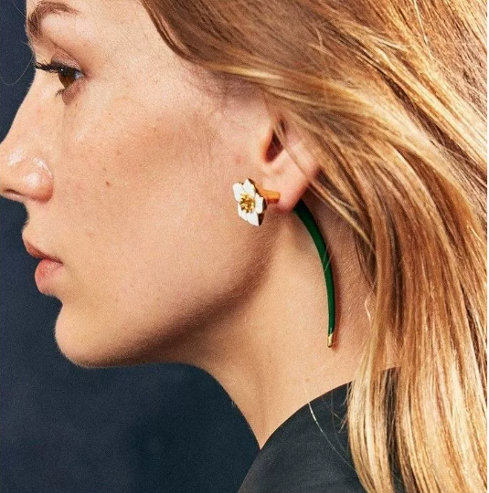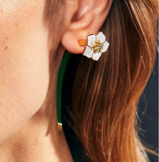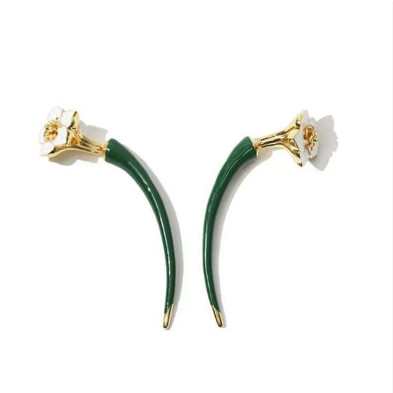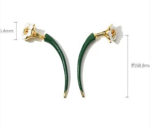 **Question 2:** What is the material of the avocado green camellia flower earrings?**Answer 2:** The earrings are crafted with high-quality enamel and feature a delicate camellia flower design.