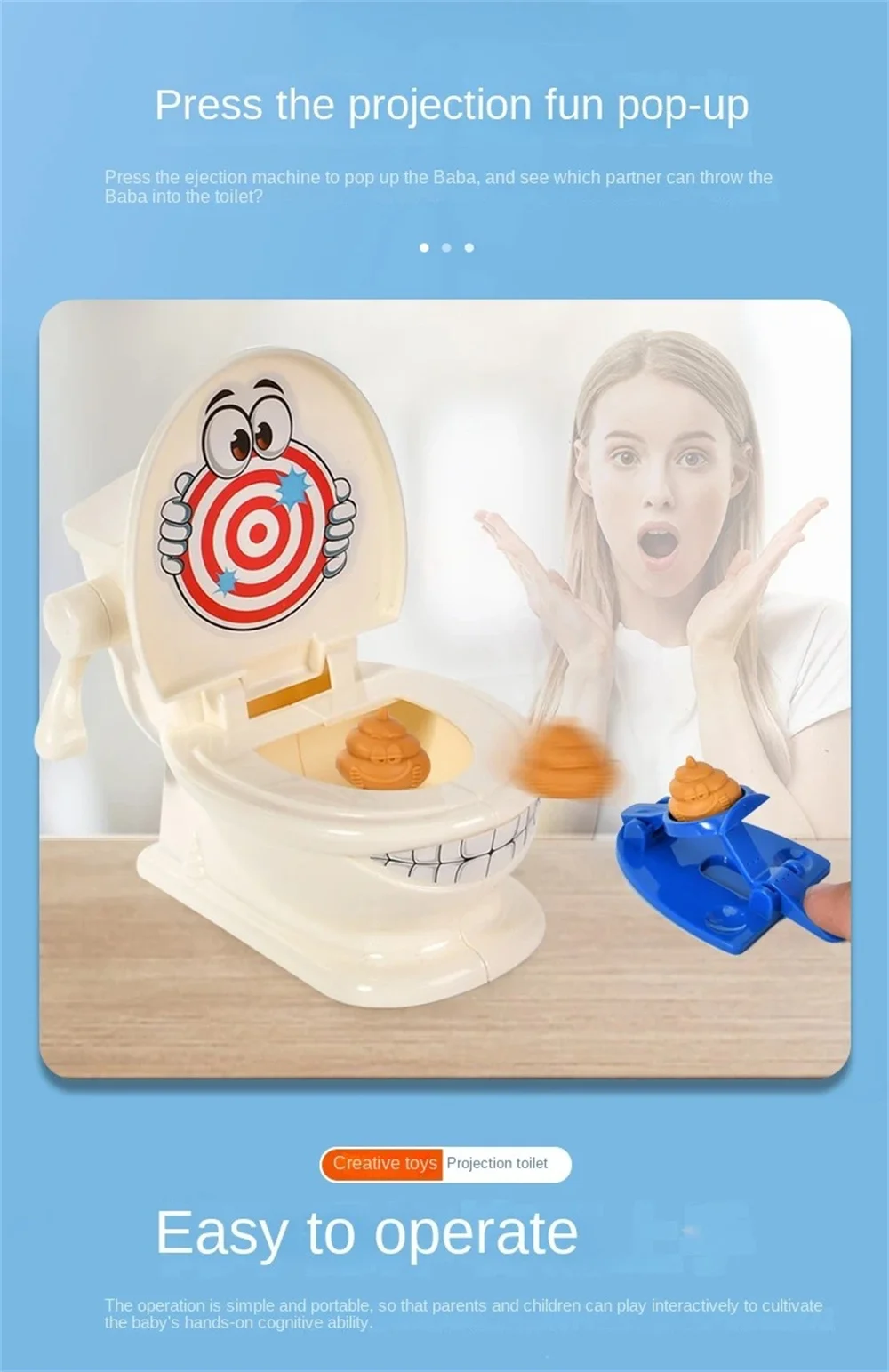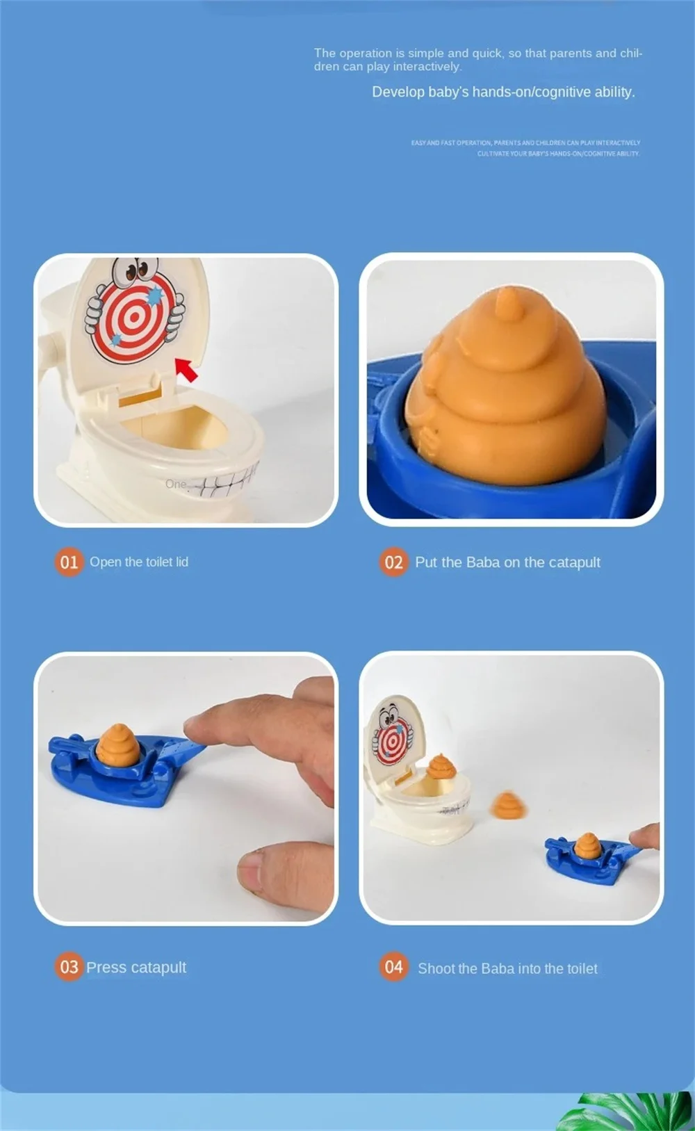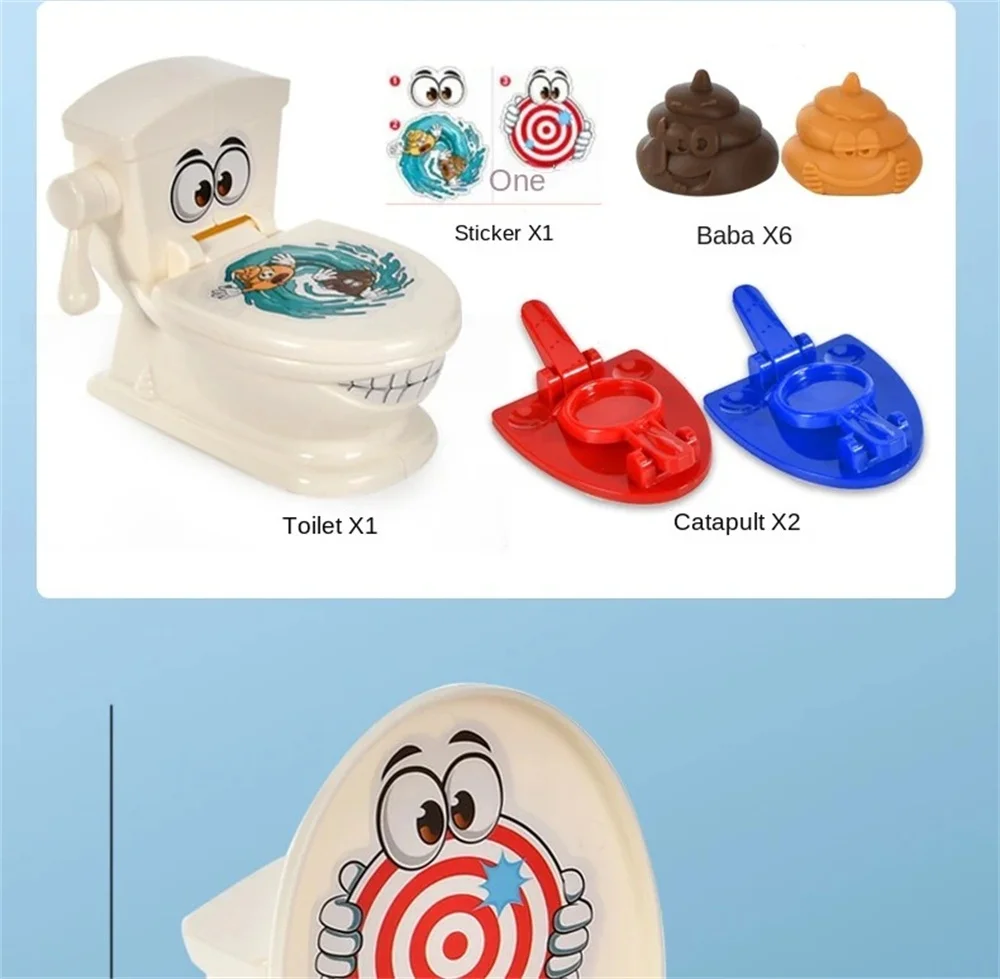 How to play: Double PK ① Fun-filled bath! 2 Read, aim... and eject! The catapult drops the poop into the toilet! ③ Win the game! The first one to throw all the poop into the toilet, then close the toilet lid,